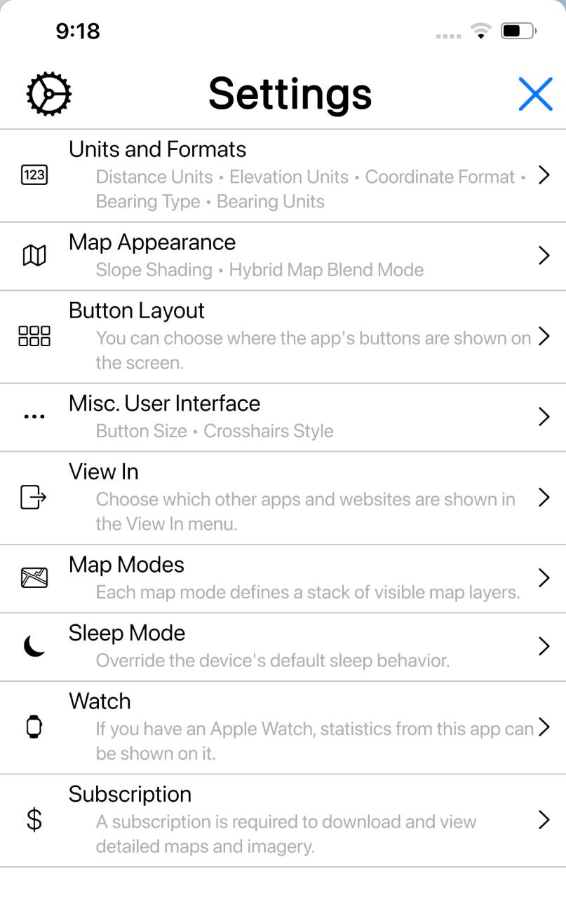 Show the Settings screen, where you can set measurement units,