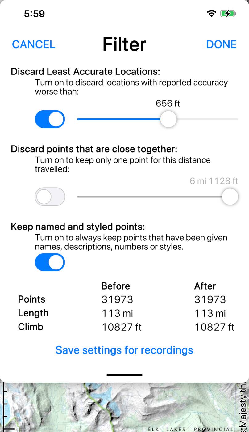 - Discard points with no elevation: (Not shown in the screenshots). Turn this on and points that don’t include an elevation value will be filtered out. Generally, accurate points from the GPS will include elevation; less accurate points from other location sources will not. Turning this on will improve graphs of elevation.